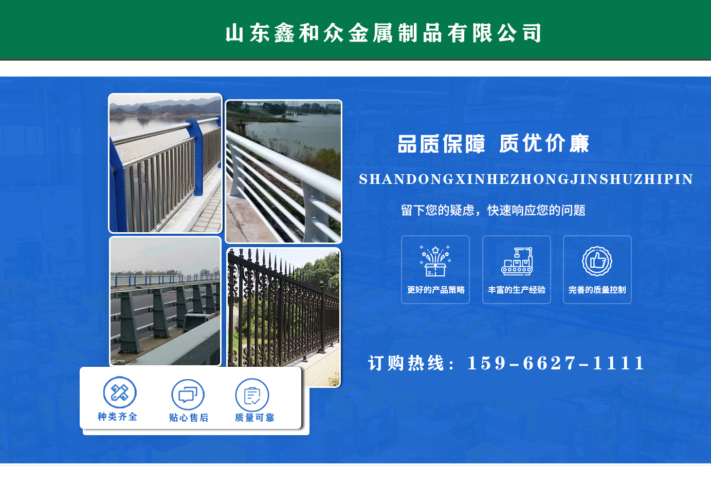 山東鑫和眾金屬制品有限公司主要產(chǎn)品有防撞護(hù)欄,橋梁護(hù)欄,道路護(hù)欄,河道護(hù)欄,不銹鋼護(hù)欄等護(hù)欄。提供設(shè)計(jì)方案,一站式定制,包您滿意價(jià)格優(yōu)惠,歡迎來(lái)電咨詢! 公司常年從事銷售護(hù)欄防撞護(hù)欄,橋梁護(hù)欄,道路護(hù)欄,河道護(hù)欄,不銹鋼護(hù)欄,橋梁鋼護(hù)欄,河道燈光護(hù)欄等。產(chǎn)品廣泛應(yīng)用于橋梁、河道、旅游景區(qū)、道路、公路、公園、小區(qū)、景觀、道路防撞等領(lǐng)域。 公司產(chǎn)品均采用優(yōu)質(zhì)不銹鋼材料,符合相關(guān)標(biāo)準(zhǔn)。各種型號(hào)不銹鋼復(fù)合管及護(hù)欄,質(zhì)量嚴(yán)格把控。產(chǎn)品強(qiáng)度高、耐腐蝕、焊接牢固、抗沖擊、性能好,防撞護(hù)欄結(jié)構(gòu)簡(jiǎn)單、美觀實(shí)用大方?! g迎前來(lái)訂購(gòu)!...
